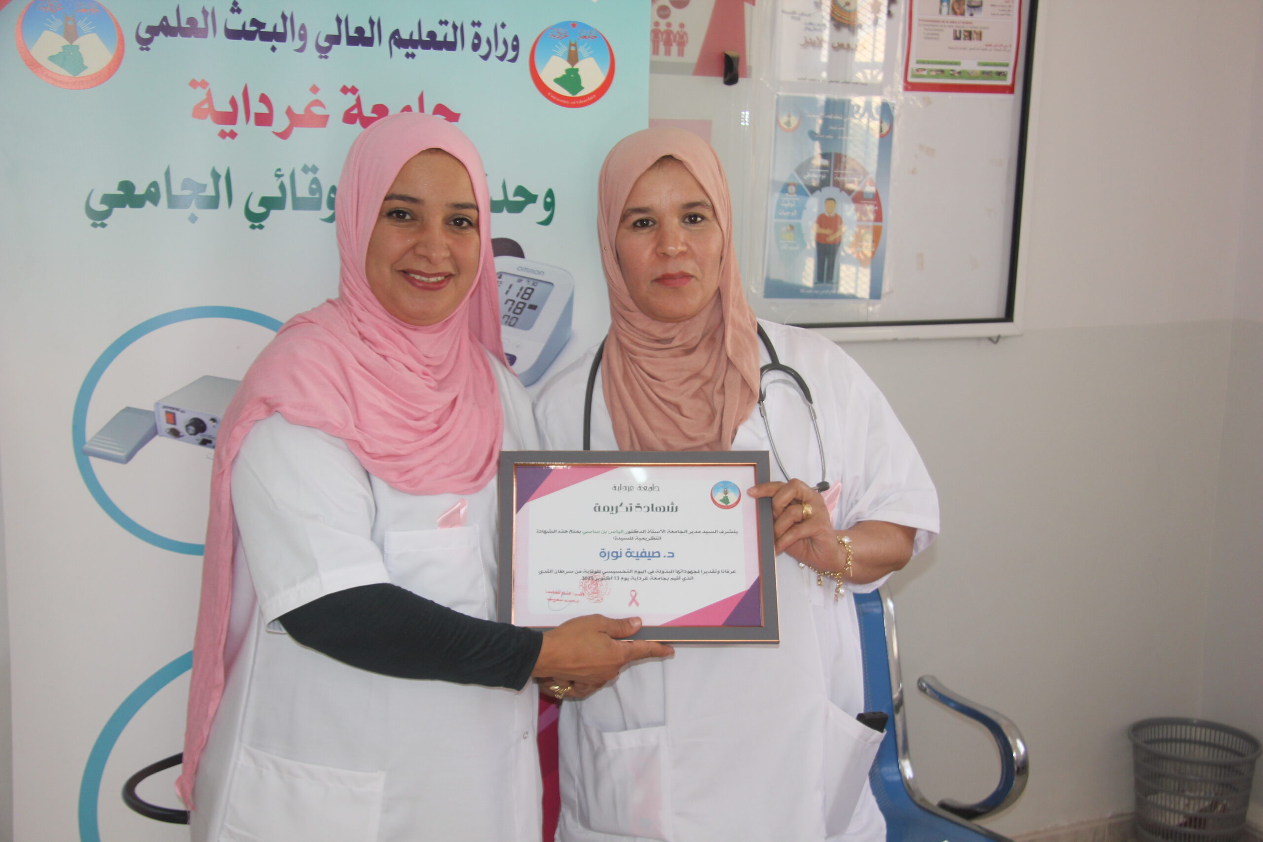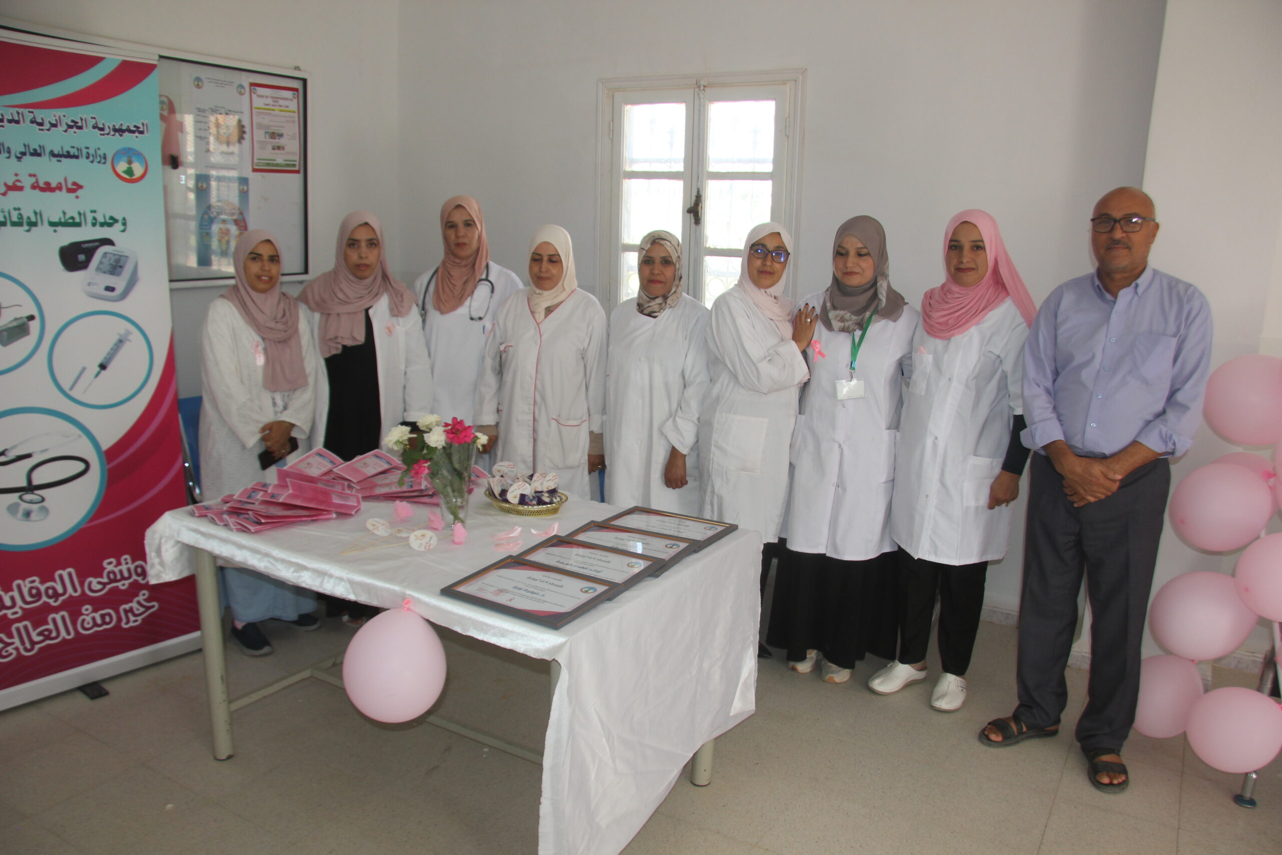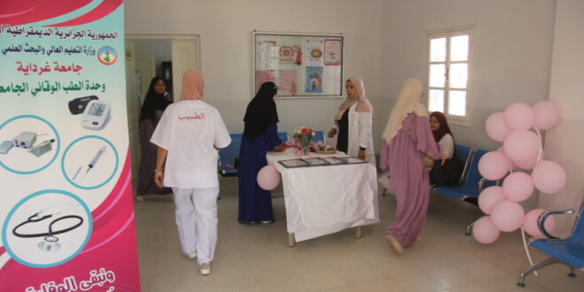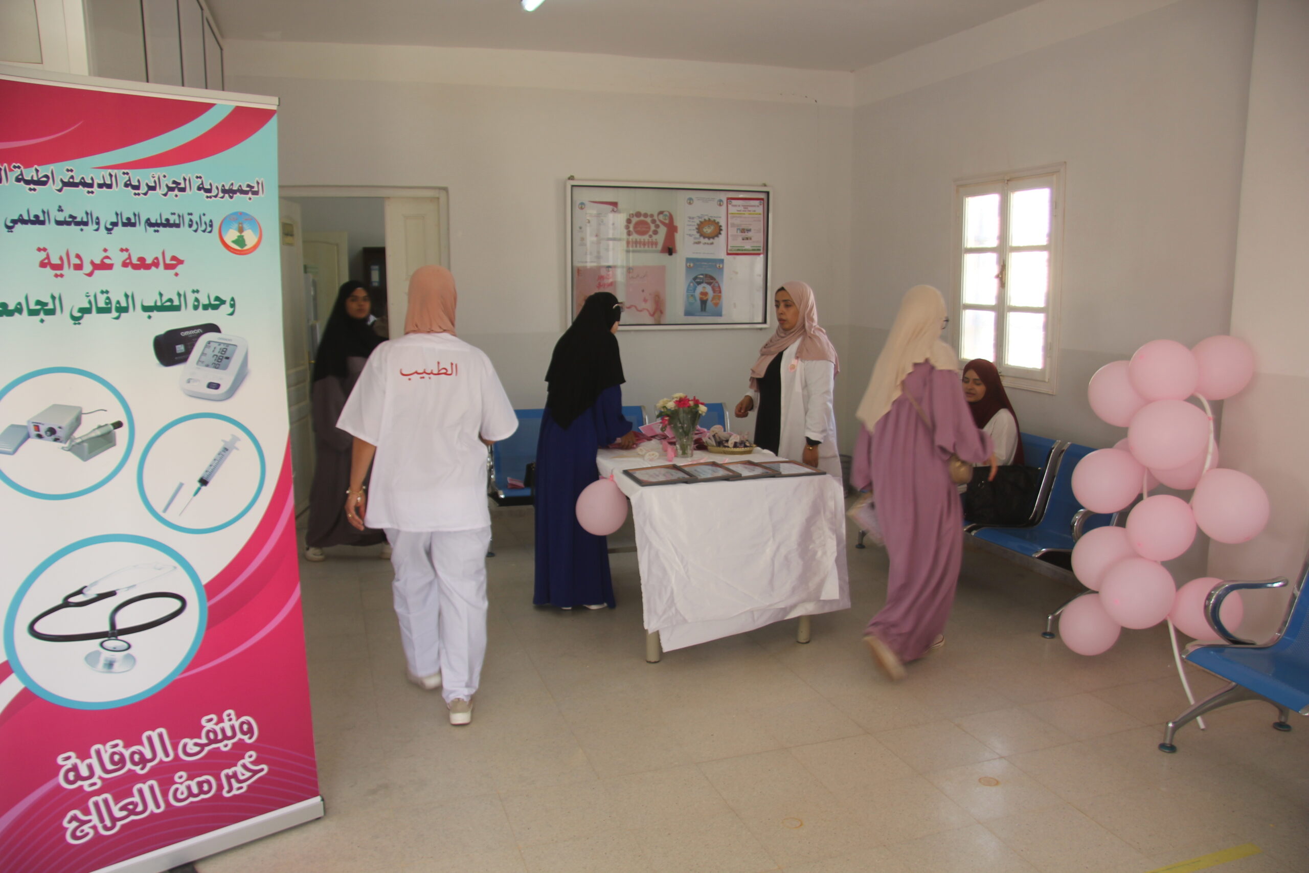 في إطار فعاليات شهر أكتوبر الوردي (october rose) وتحت إشراف السيد مدير جامعة غرداية، نظمت يوم الاثنين 13 أكتوبر 2025 وحدة الطب الوقائي الجامعي عيادة القطب رقم 03 فحوصات طبية وتحاليل مجانية تحت شعار (افحصي مبكرا لا تنتظري الأعراض) وذلك من طرف أطباء وقابلات في الصحة العمومية لفائدة جميع الطالبات والعاملات بمختلف الرتب.